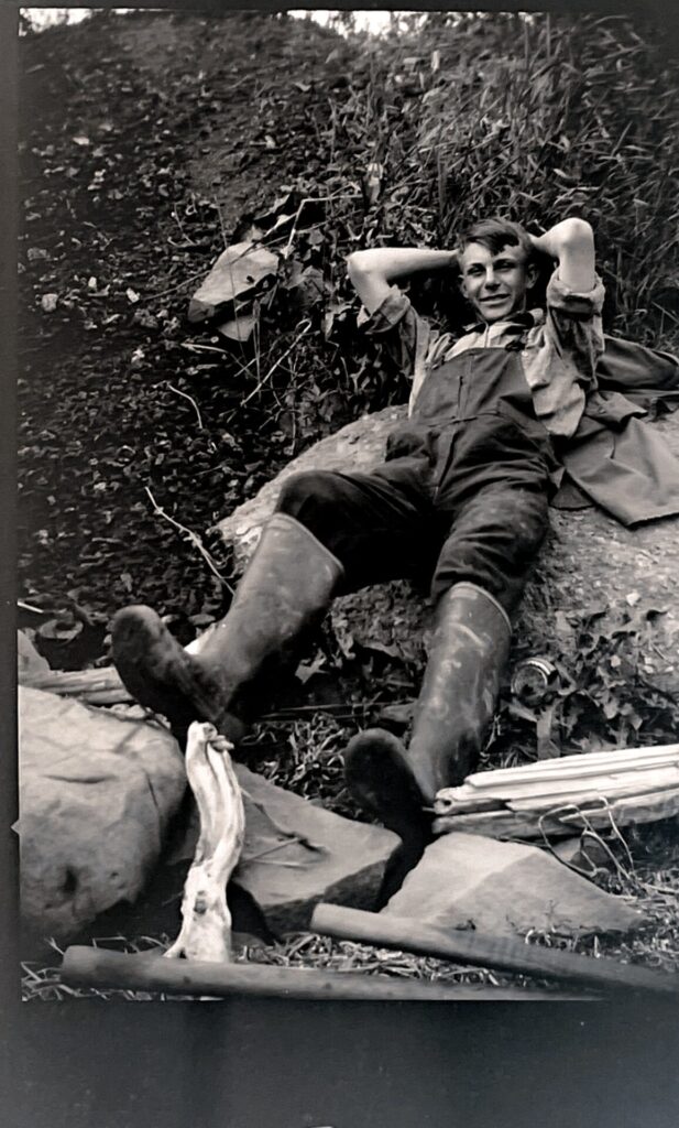 Image obtained from an old negatives. Man in coveralls and rubber boots laying on hill with tools. Believed to be someone from the MacPhie family.