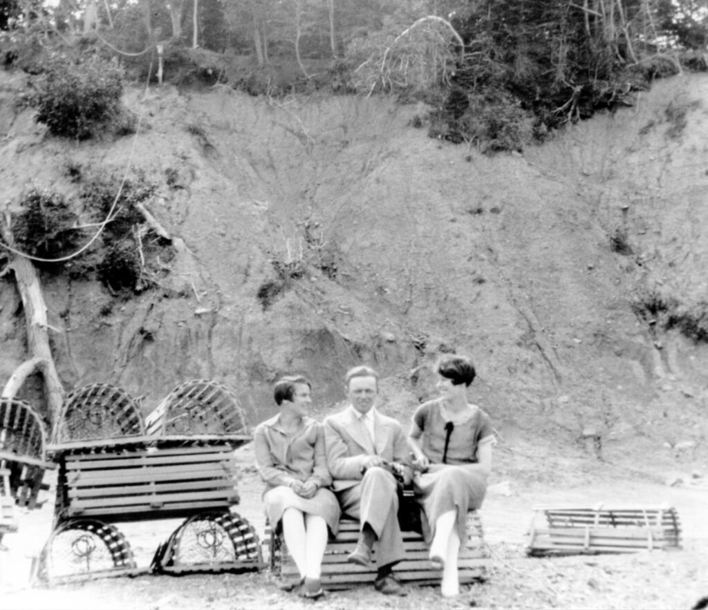 Peggy MacPhie, Albert Whidden and Lillian MacNaughton sitting on lobster traps down on a beach at Cape George.