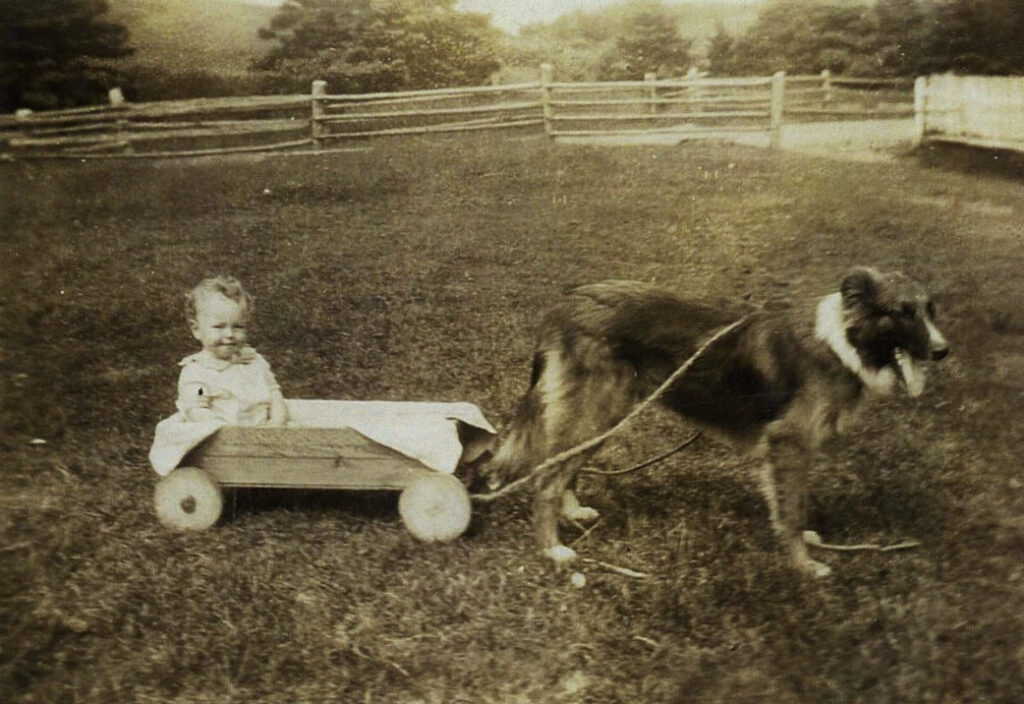 Alvan/Alvin Boyd up at the Hughie MacInnis farm at the point. In a wagon being pulled by a dog. 1926