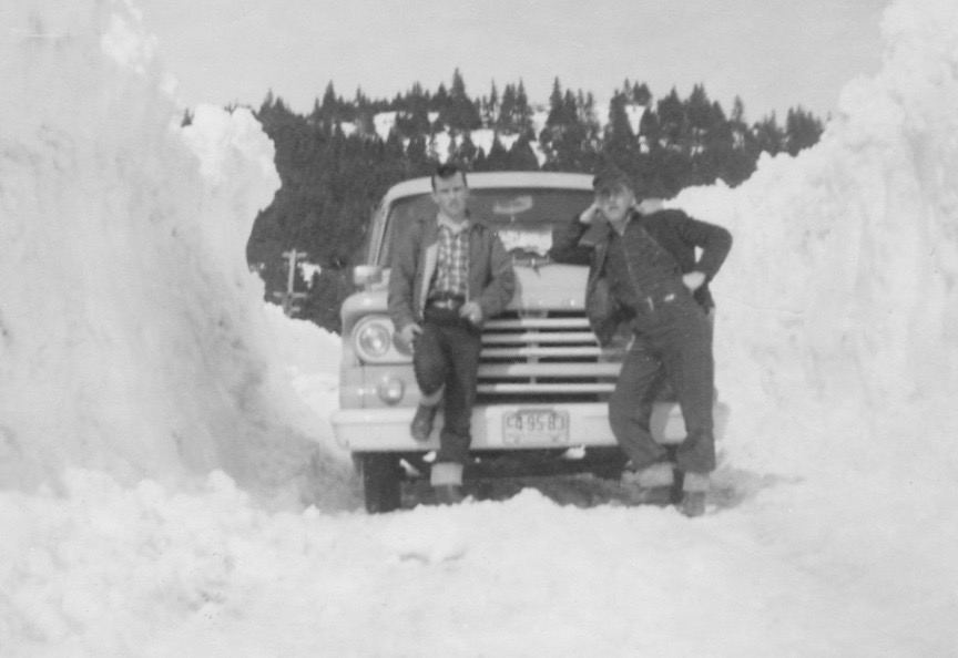 Louie MacEachern and Sonny(Hugh D) MacInnis in front of truck which is between two snowbanks that are taller than the car.