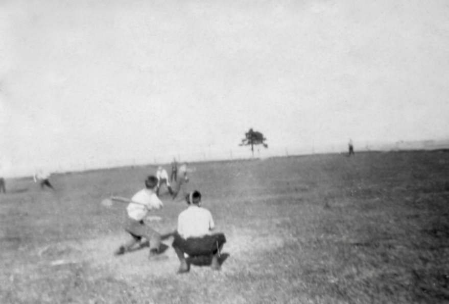 Photo of a baseball game in a field. Batter and backcatcher, pitcher. Looks like boy on 2nd base. The notation on the photograph was “Casey at bat”.