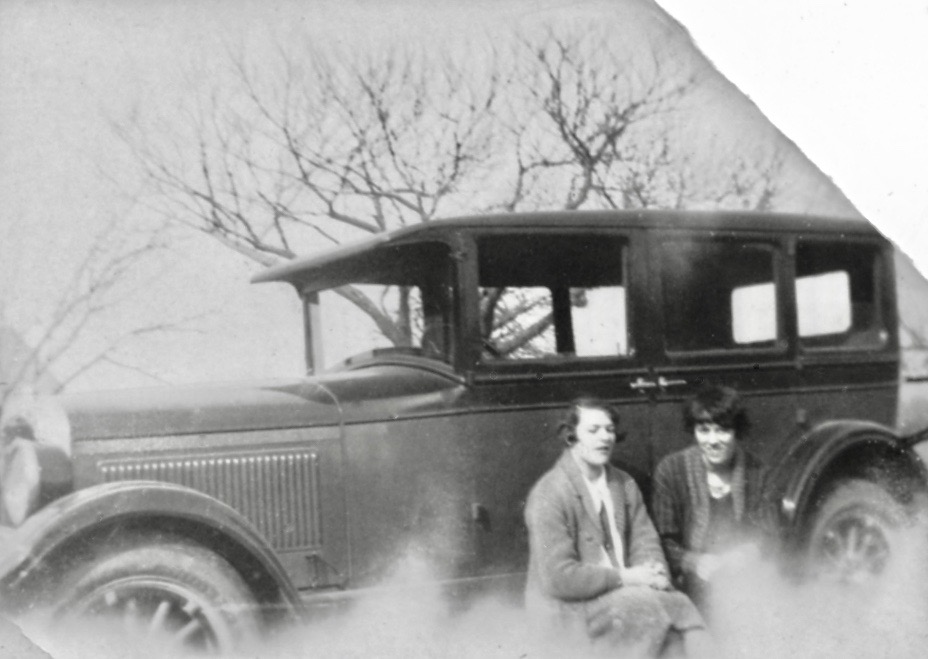 Photo of two women sitting on running board of old car. Photo very damaged. The two women are Peggy MacPhie and Annie MacNaughton.
