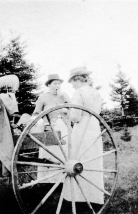 Two women at the back of a wagon. The woman facing the camera is believed to be Annie MacPhie/Ballantyne.