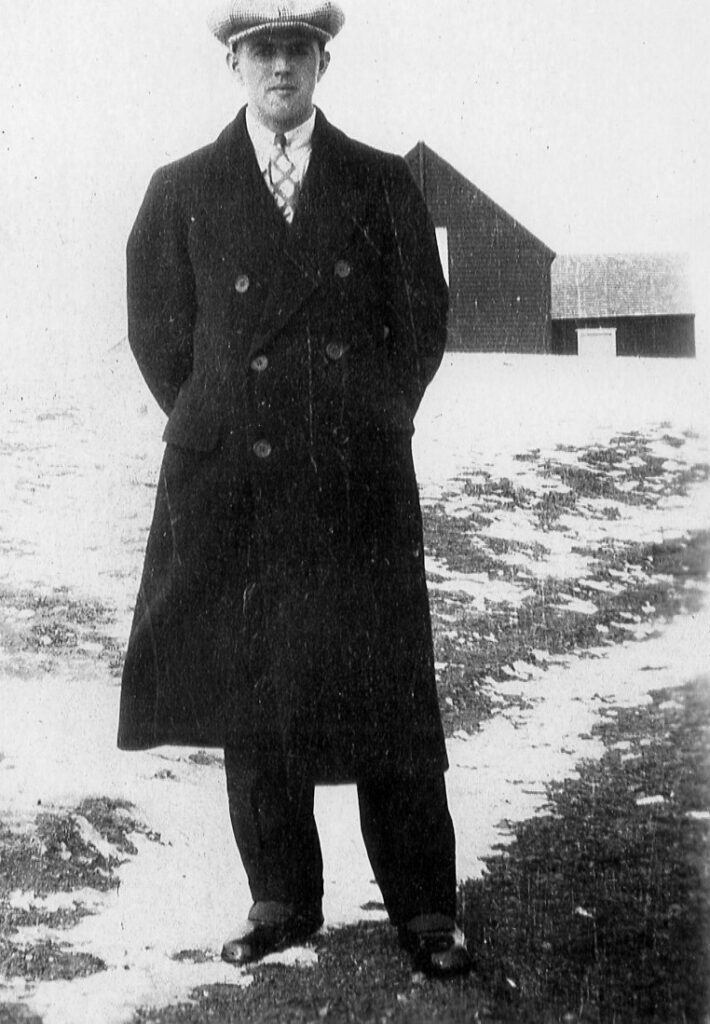 Photo of Kimball Falkenham in wintr posing at farm with a long winter coat on.