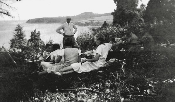 Patricia Dawe with family and friends picknicking in woods up behind Don Lauchie MacEachern’s place.