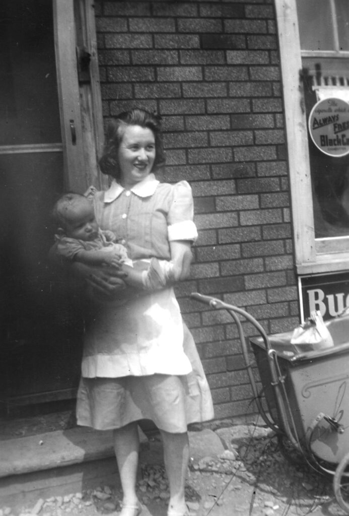 Woman and baby outside of a store. Woman is “Sparkie” Cecelia Moore/Bouchie. Baby is unknown.