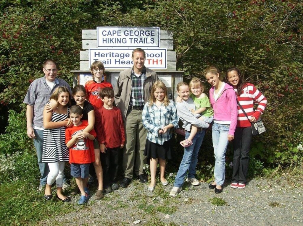 Group of youth with Peter MacKay in front of the Hiking Trails sign. Back Row (L to R). Colin Jr. MacDonald, Unknown, Peter MacKay. Middle Row (L to R) Emily Falkenham, Sarah Jane MacDonald, Jeremy Falkenham, Cassie MacGillivray, Unknown holding Skye MacGillivray, Unknown, Unknown. Front Row: Charlie MacDonald