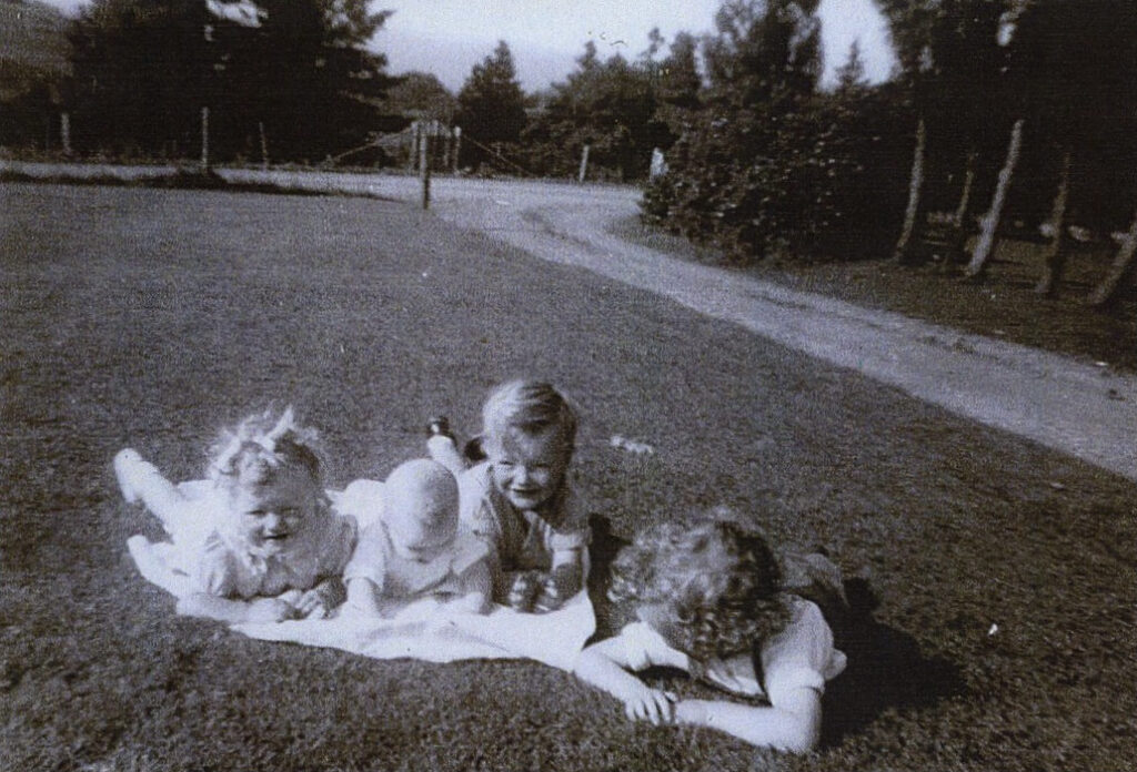 4 kids on a blanket in a yard. 1954. All siblings: Martha, Hilma, Hugh and Blaise MacInnis.