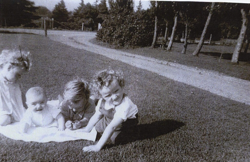 4 kids on a blanket in a yard. 1954. All siblings: Martha, Hilma, Hugh and Blaise MacInnis.