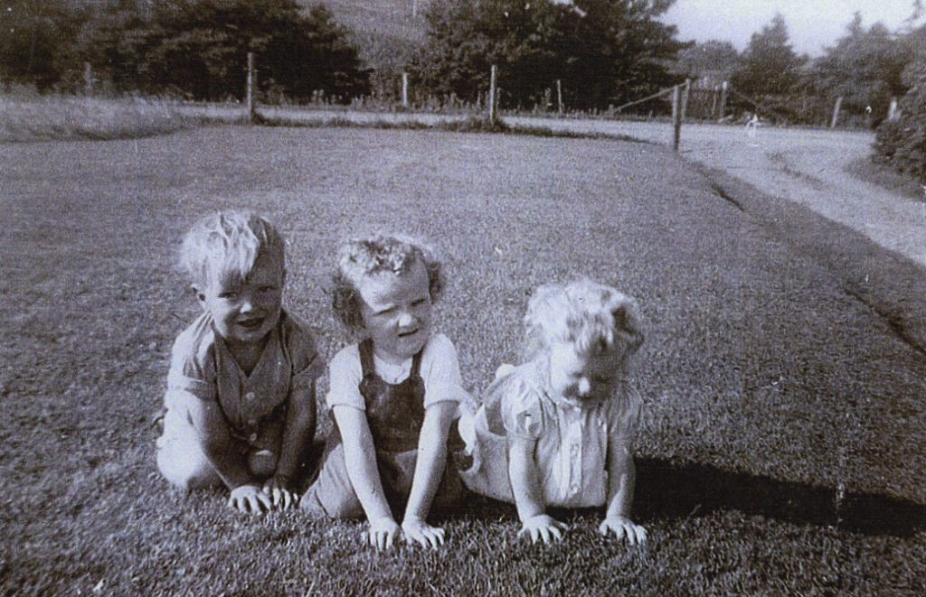 3 kids on a blanket in a yard. 1954. All siblings: Hugh, Blaise and Martha MacInnis