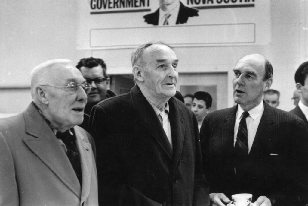 Three men at a hall. The man in the middle is Jim Ranald MacEachern and the man on the right is Premier of Nova Scotia, Robert Stanfield.