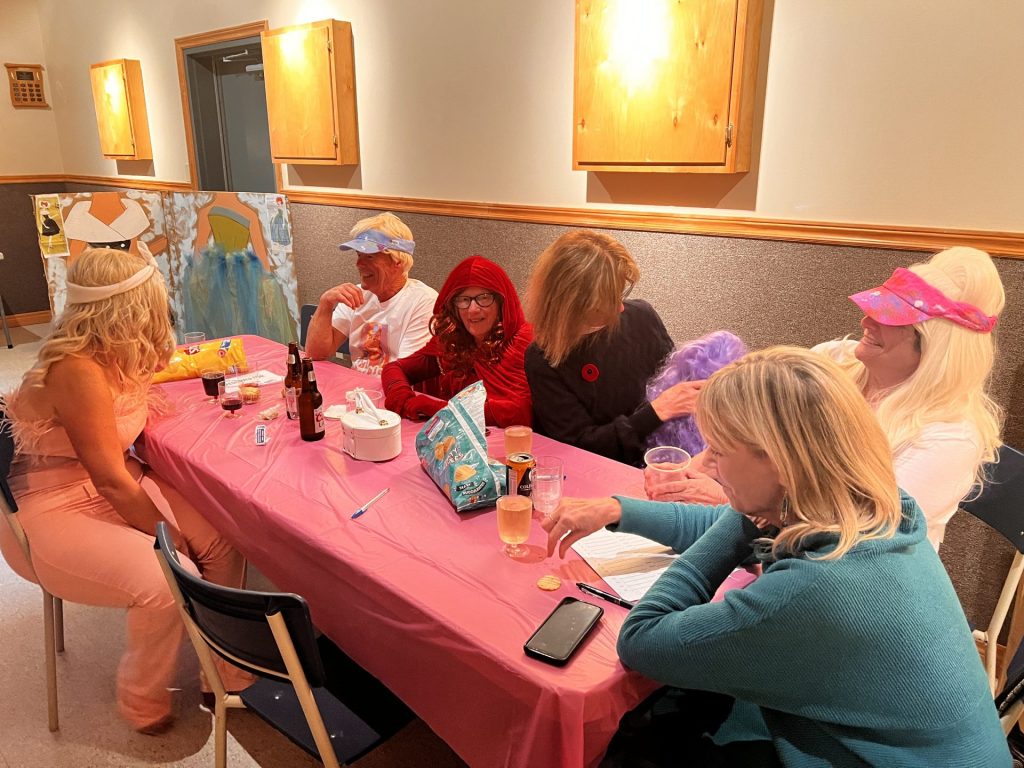 2023 Halloween Trivia Night:Left is Yvette MacDonald, Ken Barbie is Steve Mergronigle, Little Red Riding Hood is Patsy MacPhie, Valerie Chugg, Barbie is Karen Megronigle, Unknown.