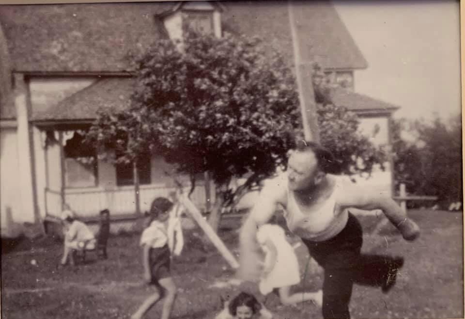 In front of the MacInnis house – Dan Hugh is throwing a ball around. Kids in background are unidentified.