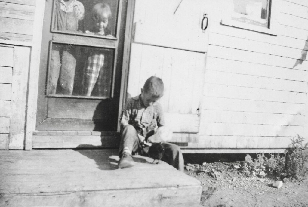 Tommy MacEachern sitting on step feeding chicken with two other children looking out of screen door.