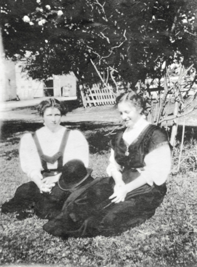 Two ladies sitting on the lawn of a house. One wearing all black, and the other wearing lighter colors. Unknown who they are.