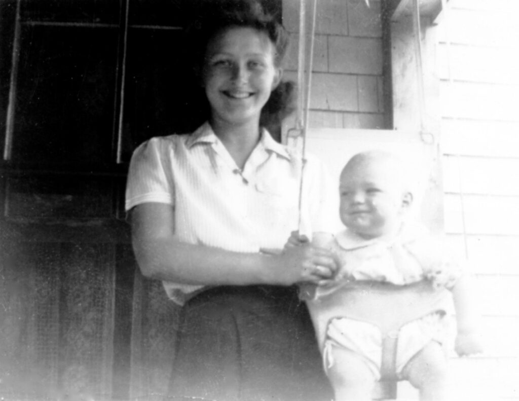 Black and white photo of a young girl on a porch. She is standing beside a baby in some sort of hanging baby seat. Back of original photo said “Ruth Cameron Frazer and Wayne Adams”
