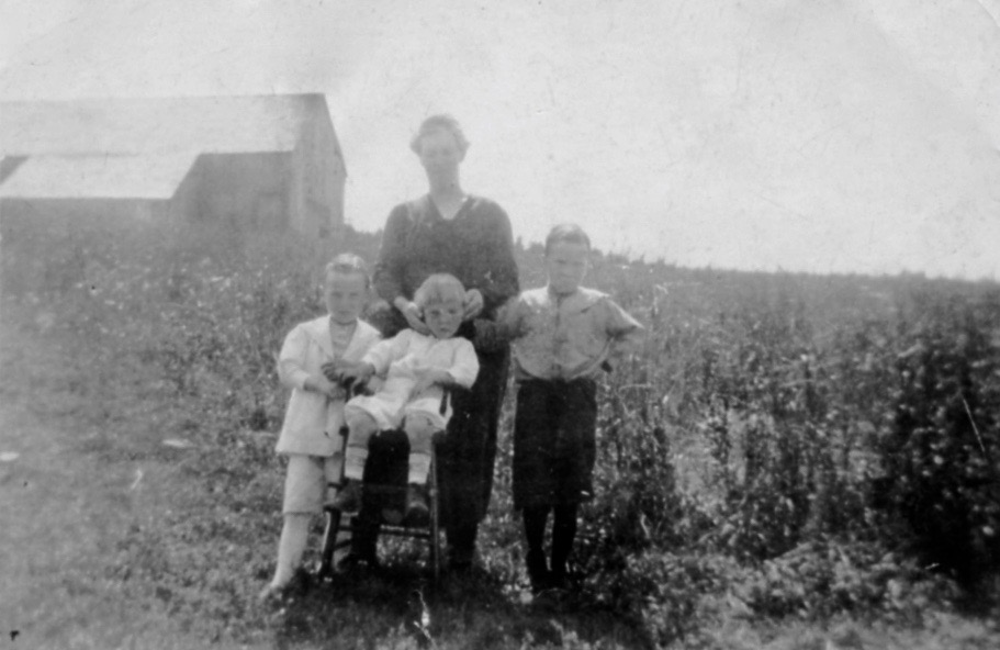 Mary Kate MacEachern with three kids standing in a field with a barn in background. Eustace MacEachern house. Children are (L to R) Gillis, Albert and Hugh Bernard MacEachern.