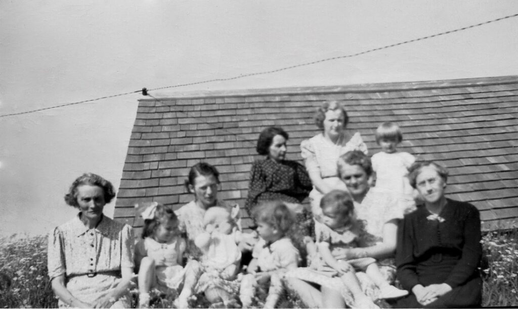 MacEachern lighthouse road home. Group on the roof of the coal shed. Kimball Falkenhams mom Cassie Falkenham on left.