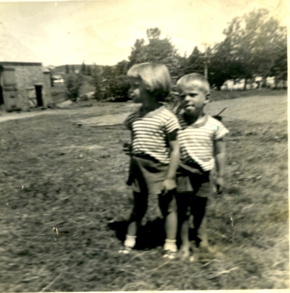 Valerie Chugg and Donald Haskett in matching striped t-shirts. Dated July 1952