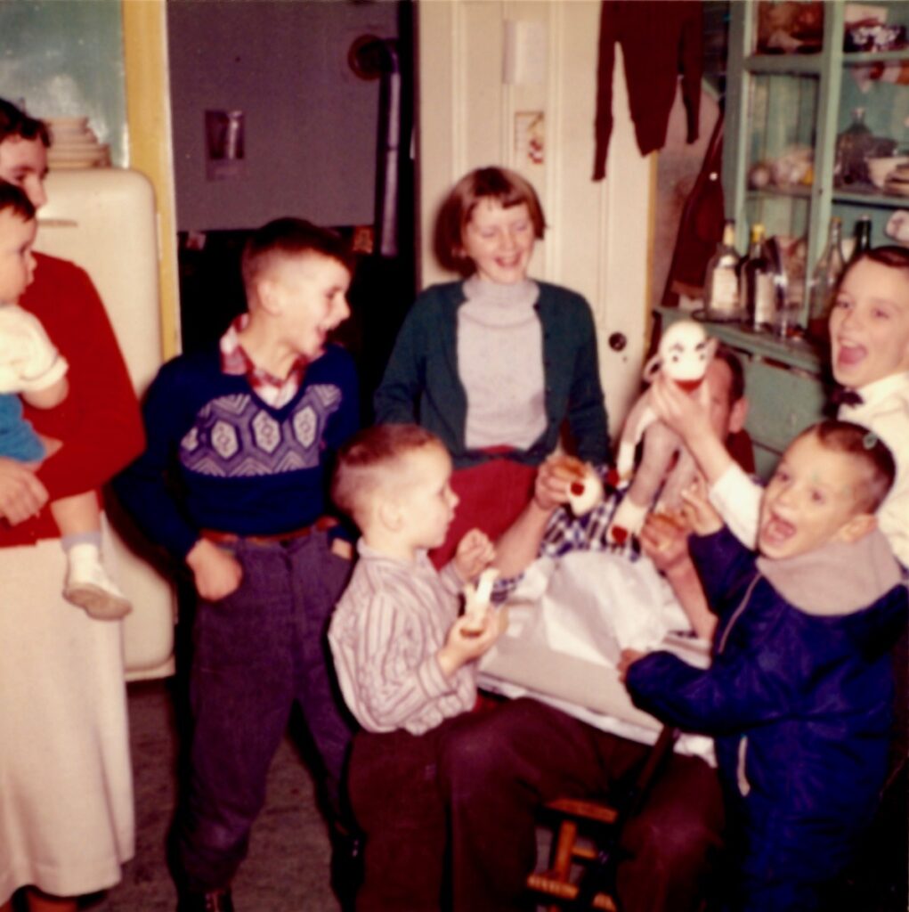 Christmas 1961. Himmie Ballantyne sitting down with neices and nephes around. Donald, Valerie Haskett and MacIntyre and Wallace kids.