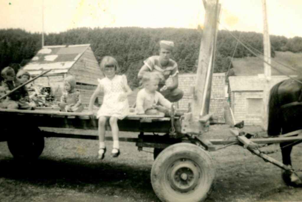 Six kids on a wagon hooked up to a horse. Jimmy and Leonard MacPhie, Gloria, Sharon, Valerie and Donald Haskett.