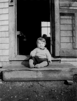Toddler in doorway of house at Cape. Ronny MacInnis