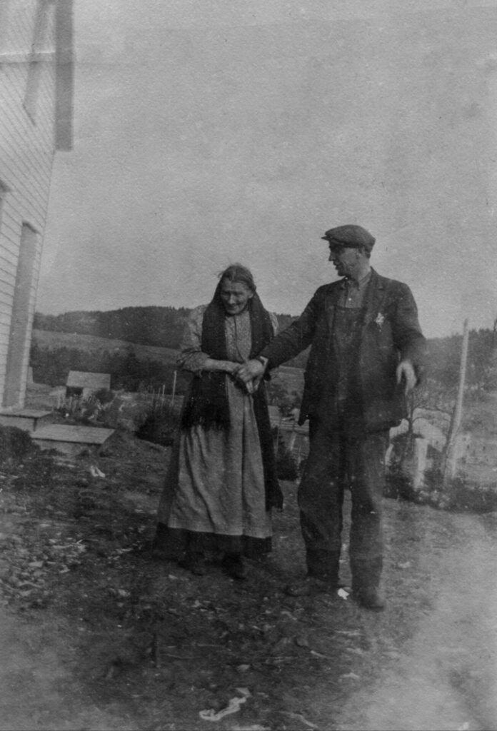 Woman and a man walking outside of a house. James F. MacEachern and Aunt Christy.