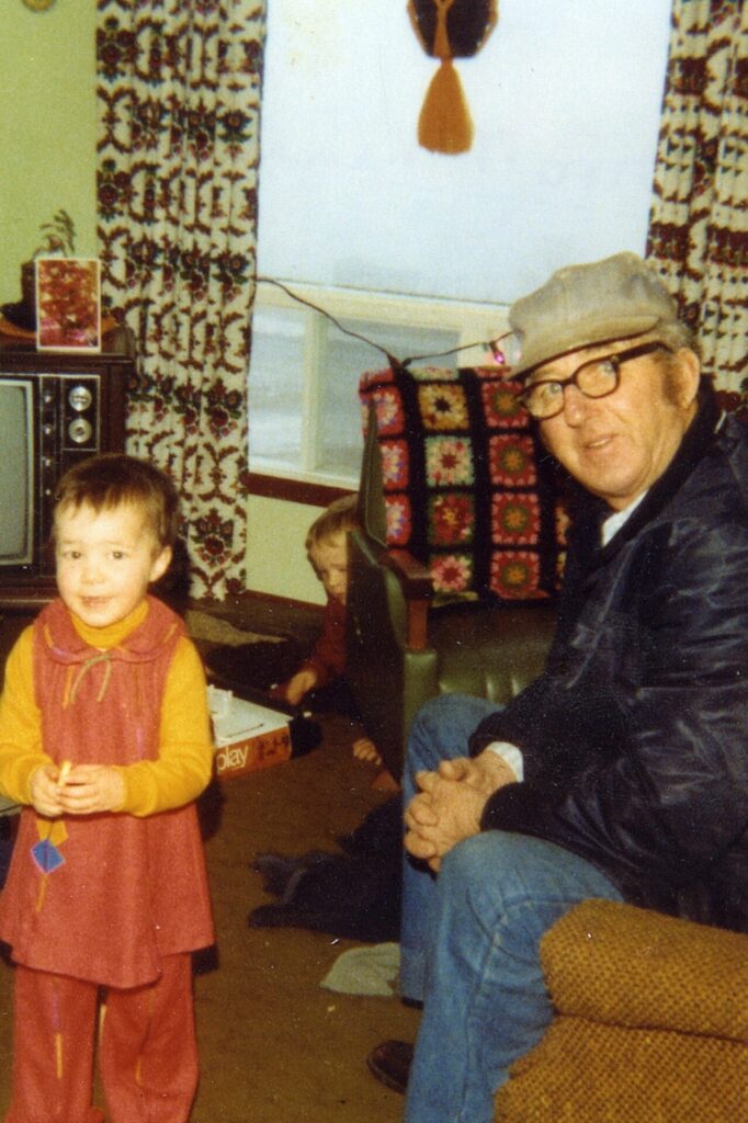 Man and little girl sitting in livingroom. Morrison MacEachern with his grandaughter Shana MacKenna