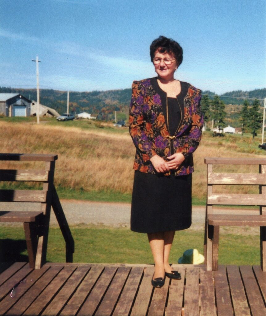 Gail MacEachern/McKenna standing on her front deck. 1994