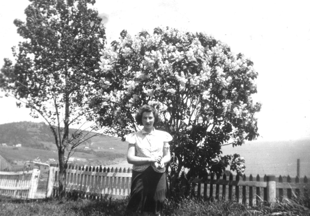 Mary Margaret MacEachern standing in a yard, tree’s and cove/point in background.