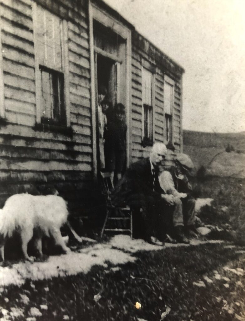 Two men sitting outside a house with a few kids peering out the door. Men are John Hugh (John Vec) MacInnis and Hugh C. MacInnis. Children are unknown.