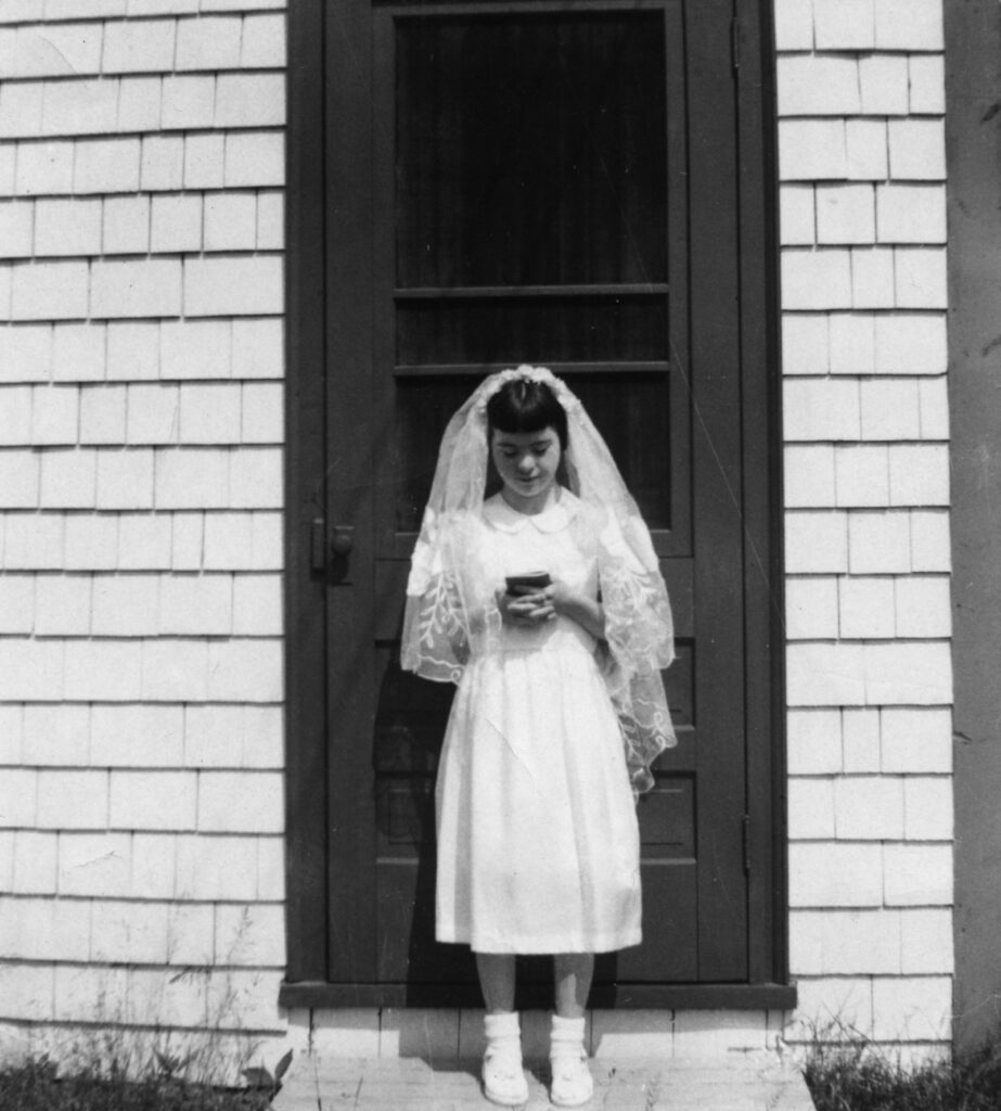 Girl on step of house wearing confirmation dress. “Nan” MacEachern