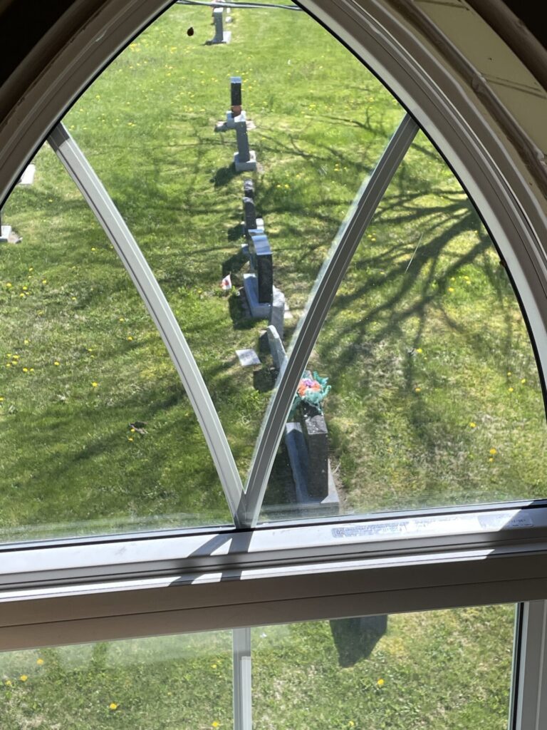 Looking out one of the side windows into the cemetery at Holy Rosary church (2021)
