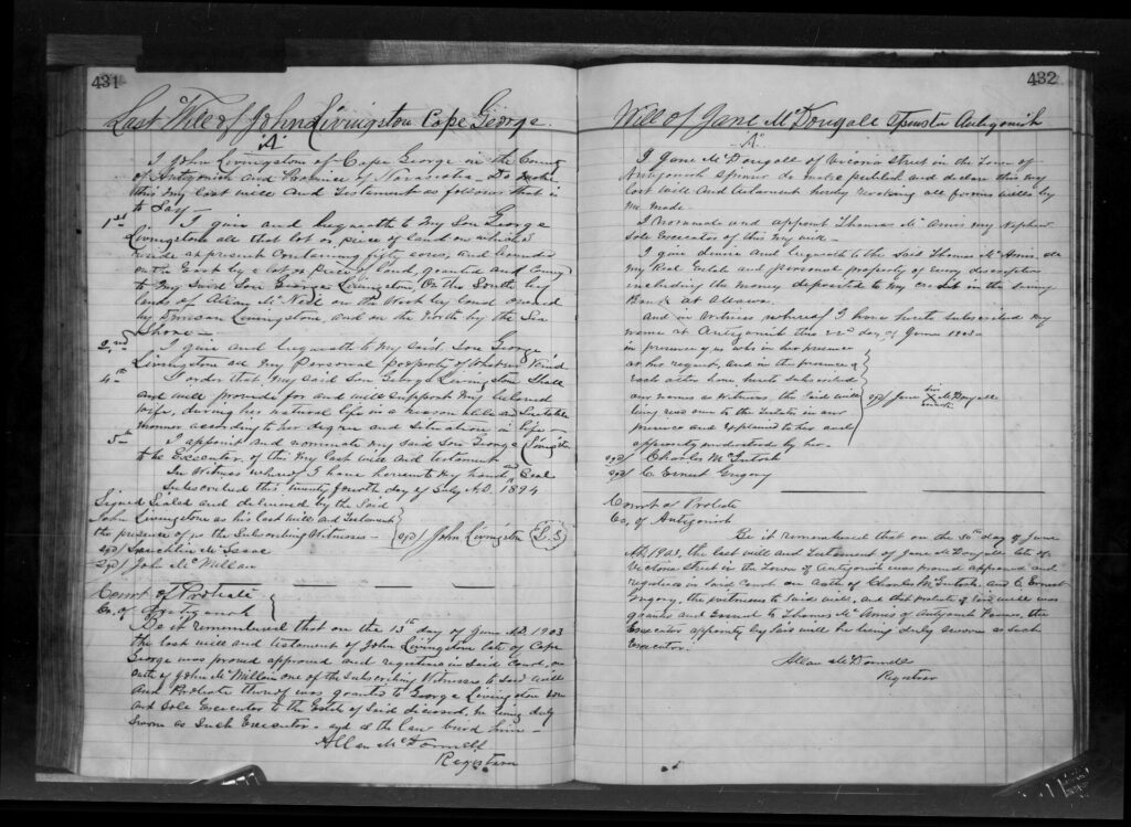 Will and Probate of John Livingston (1825-1908), dated 4 Jul 1894 and 13 Jun 1903 for the probate. He leaves his entire estate to his son George Livingston (1868-1953). He had other children, but by the time he passed, his wife Rachel was deceased.