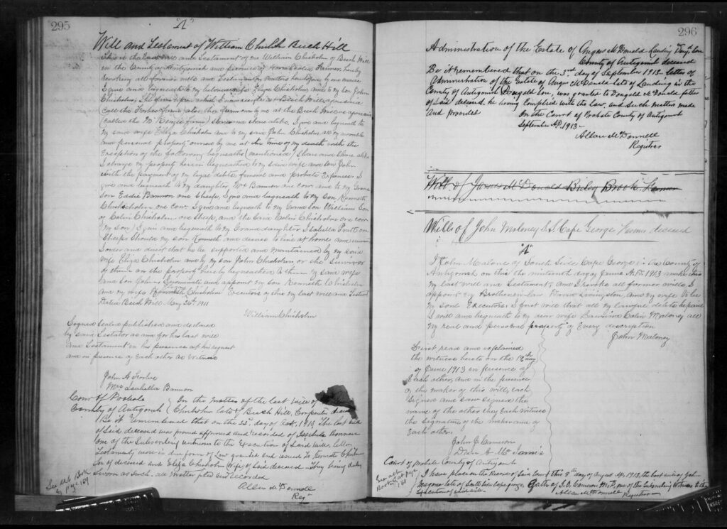 Will and Probate of John Malone of SS Cape George (????-1913) Will dated 19 Jun 1913 and the Probate dated 8 Aug 1913 when he died. Record of death at St. Columba Parish but no details given. In his will he leaves everything to his wife Laurina Malone (Livingstone). It’s spelled with a “B” but after searching records, we believe that she is actually Laurina based on census records and that he names his brother-in-law as David Livingstone. No clues as his possessions are not named so maybe he did not own property.
