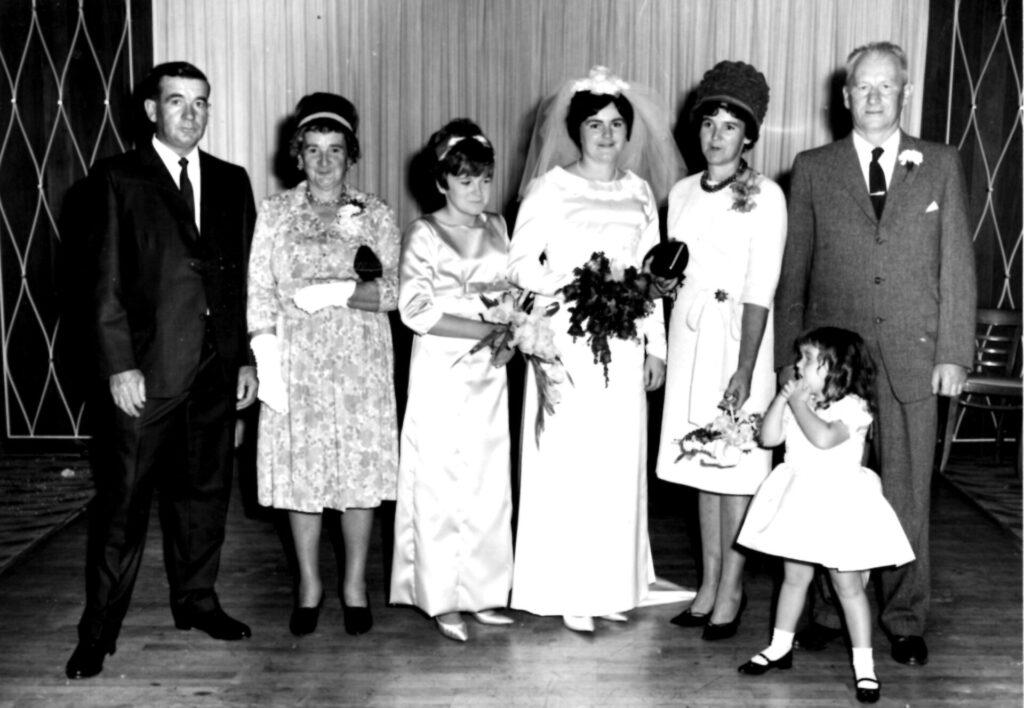 Gerald Ball, Bessie Ballantyne, Joyce Wallace, Betty Wallace, Helen Wallace and Frank Wallace. Little girl is Eleanor Wallace