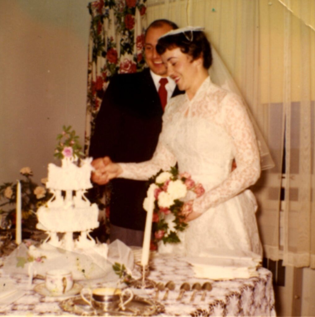 Jean Ballantyne and Ross Langley cutting their wedding cake.