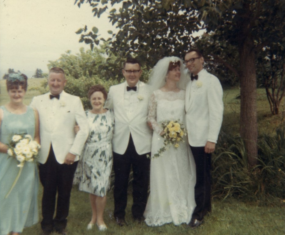 bridal party from 1968 (L to R). Charlotte (Roberts) MacIssac, Larry Roberts, Unknown, Allan Roberts, Marguerite (Roberts) Birette and her husband Joe Birette