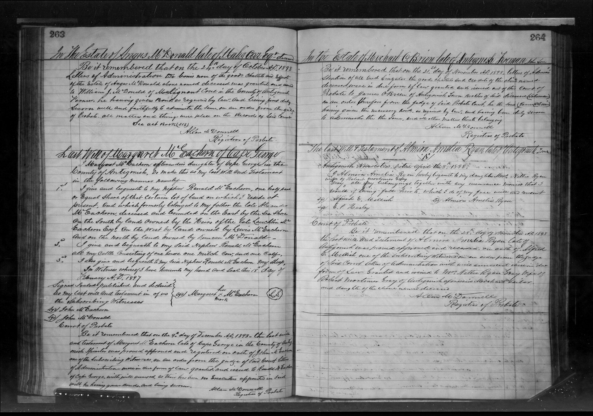 Will of Margaret McEachern dated Dec 9 1898. She is the daughter of Alexander. Will speaks only to her nephew Ranald/Ronald McEachern.
