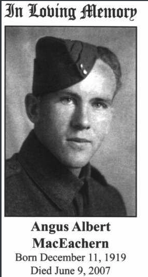 Black and white photo of the funeral card of Angus Albert MacEachern. Photo from when he served in the military and he is in uniform.