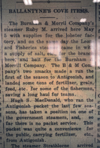 The Burnham & Morril Company’s steamer Ruby M. arrived here May 5 with supplies for the lobster factory, and on the same day the Leonard Fisheries steamer came in with a supply of salt, etc., for the branch here; and bait for the Burnham & Morrill Company. The B&M Company’s two smacks made a run the first of the season to Antigonish, and landed some tons of fertilizer, grain, feed, etc. For some of the fishermen saving a long haul for teams.