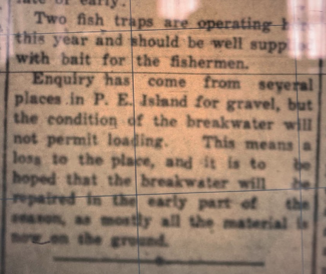 Enquiry has come from several places in P.E. Island for gravel, but the condition of the breakwater will not permit loading This means a loss to the place, and it is to be hoped that the breakwater will be repaired in the early part of the season as mostly all material is now on the ground.