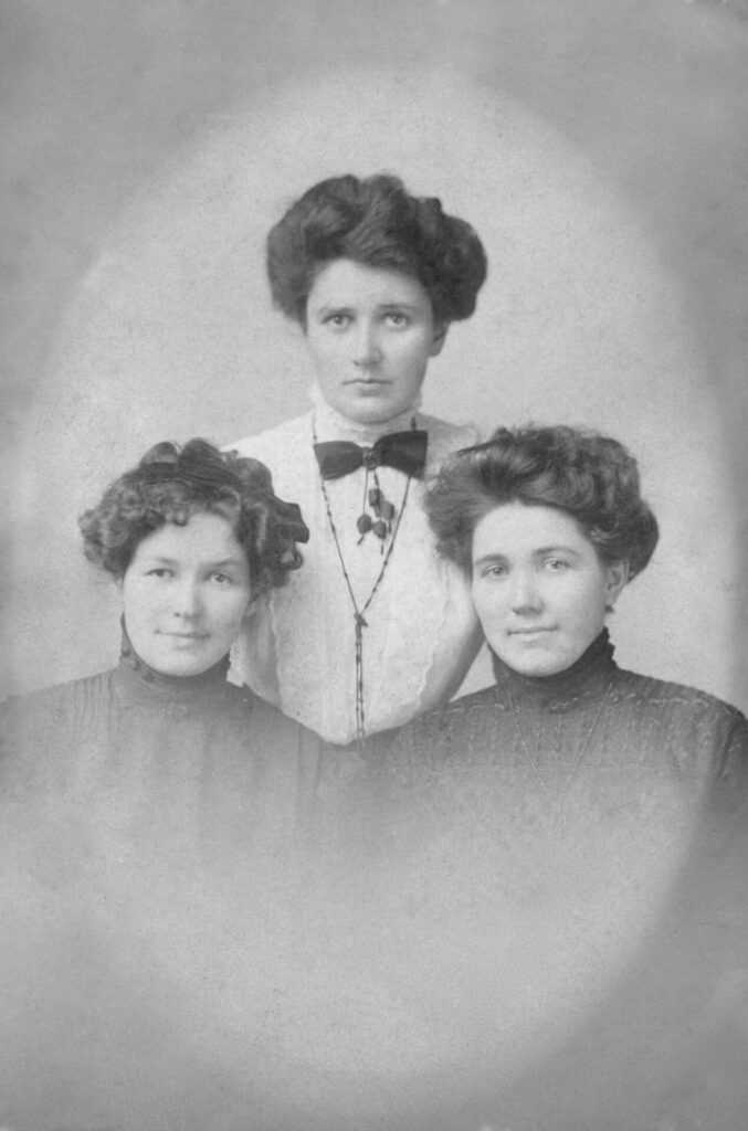 Daughters of Stuart and Margaret (Namie) Ballantyne. Circa 1905-1908. Standing is Ella (Ballantyne) Boutillier. To the left is Bessie (Ballantyne) Morrell. To the right is Annie (Ballantyne) MacPhie.