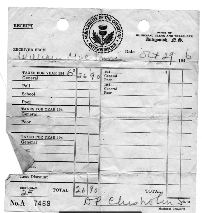 It’s interesting to see how much property tax people paid over the years. Finding the cash to pay taxes was sometimes tough and many times interest had to be paid as they could not pay the full amount by the due date. The property in question would be the William MacInnis house up by Lighthouse Road. To see the documents held, please download the .pdf file.