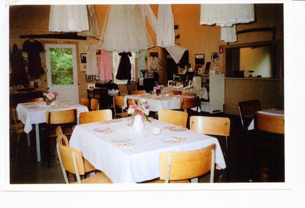 Vintage clothing display – Tables set up for tea with dresses hanging from ceiling.