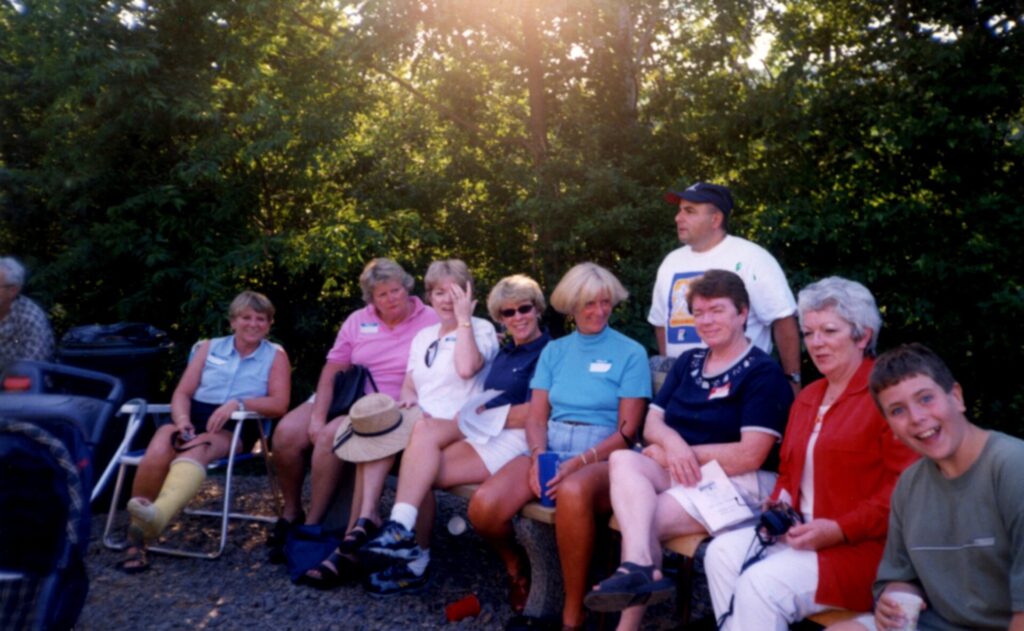 School reunion after renovations. Group of people in lawn chairs sitting out in front of school. (L to R). Joyce Wallace, Gloria Haskett, Ellen Adams, Sharon Haskett, Valerie Haskett, Joe Bishara, Karen Adams, Lois Adams and Peter Haskett.
