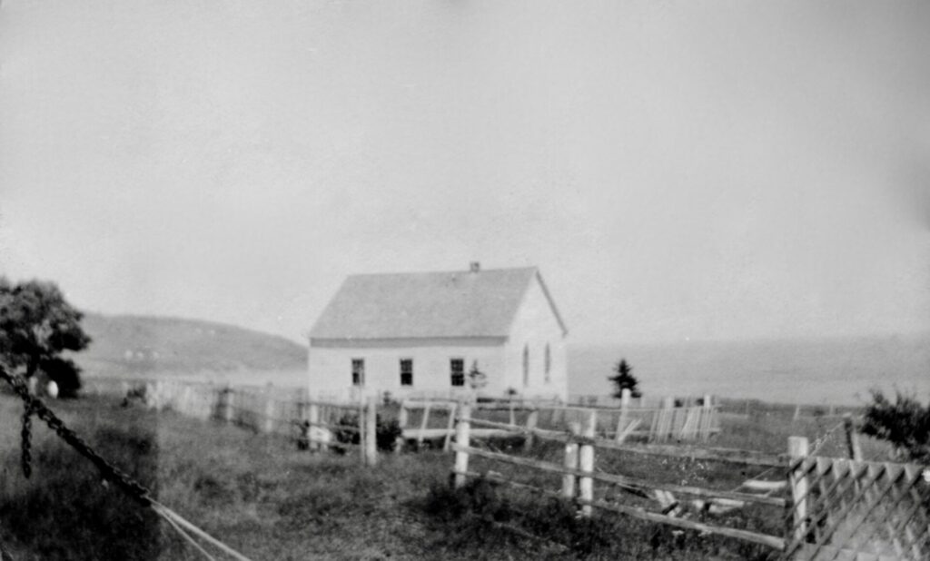 Small photo, damaged at top from being ripped out of photo book. Picture of St. David’s church before steeple built. Can see small fences around it and ocean in background.