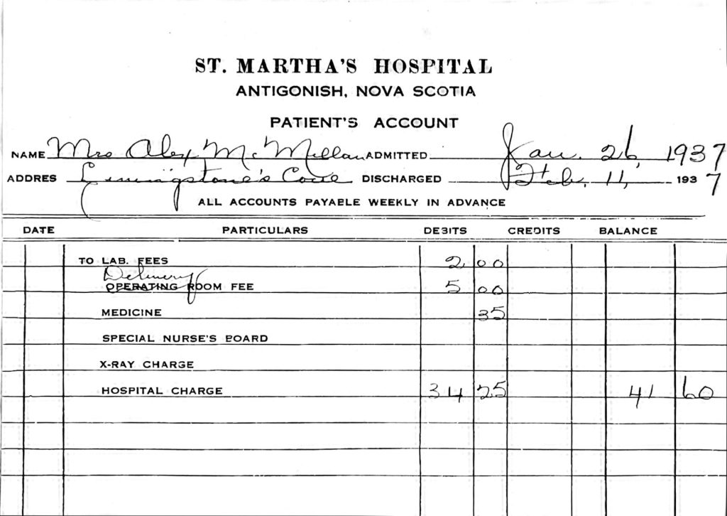 St Martha’s Hospital bill for Mrs Alex McMillan for her stay at the hospital from Jan 26 1937 to Feb 11, 1937, when she had a baby.