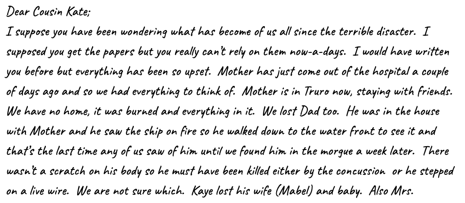 Transcribed copy of family book “Dear Cousin Kate”. A Letter from the Halifax Explosion