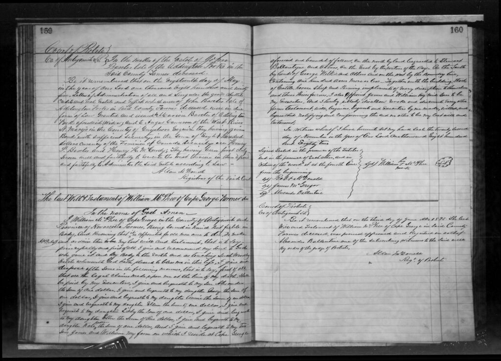 Will of William McPhee dated Nov 22, 1882. We are not sure but believe William was born in Scotland and came to Cape George in the later part of the 1870’s. His will speaks to his children, Alexander, James, William, Mary, Annie, Ellie, Lilly, Ellen and Kate.